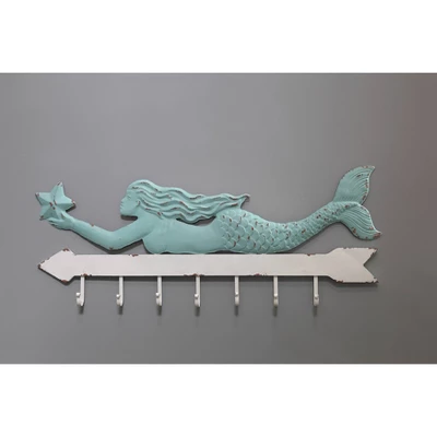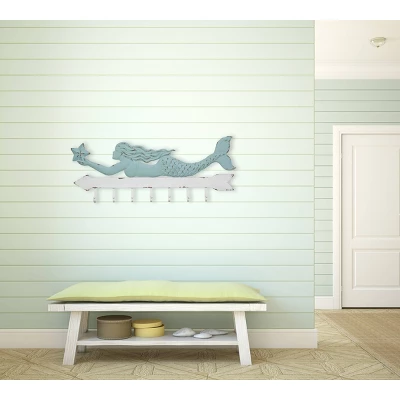 Make your wall hooks look like a piece of wall décor with this aqua and white item. Carefully distressed for an aged and unique look, this coat rack features a detailed mermaid figure. Featuring 7 hooks, this rack can help keep clothes, robes, blankets, and towels neat and easily accessible.