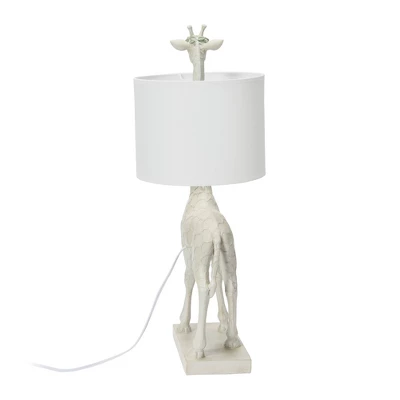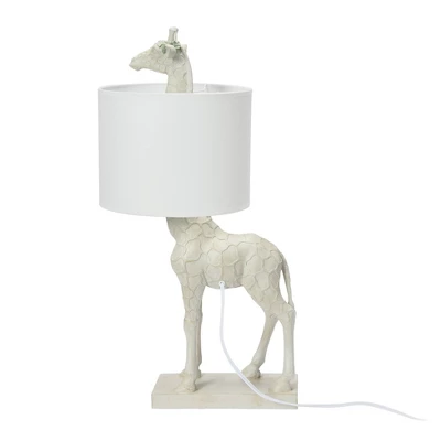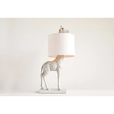 - Adorable giraffe head peaks over the top of the white linen shade