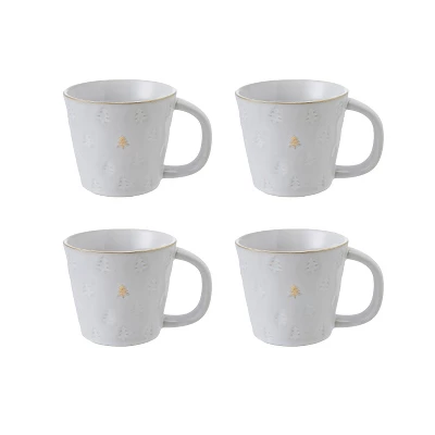 Add a touch of elegance to seasonal dining and entertaining with this set of 4 debossed stoneware mugs. Featuring tree designs and gold electroplating, each mug showcases a unique reactive glaze in white, ensuring every piece varies beautifully. Perfect for serving hot beverages and displaying on kitchen shelves or dining tables, these mugs are made of stoneware for durability. Each mug measures 4 inches in diameter and 3.25 inches in height, with a capacity of 10 ounces, making them a stylish and functional addition to any home.