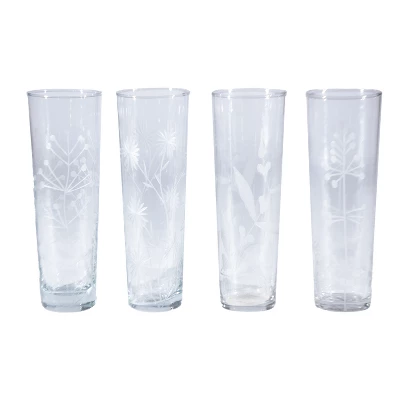 Add an exquisite handcrafted accent to seasonal entertaining with this 4-piece set of hand-blown drinking glasses, adorned with elegant etched botanical designs. Rendered in premium clear glass, each piece showcases delicate artistry, offering both sophistication and timeless seasonal appeal. Designed in four unique styles, this set seamlessly blends festive charm with refined craftsmanship, making it an ideal addition to Christmas and winter gatherings. Measuring 2.25 inches in diameter and 7 inches in height, each glass holds 8 oz, perfect for serving celebratory drinks, holiday cocktails, or refreshing beverages with effortless elegance.