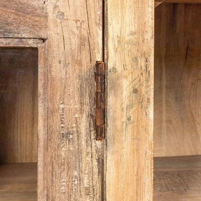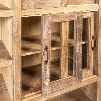 - Add a touch of natural and vintage charm to the space with this reclaimed wood cabinet that features glass doors and shelves and a sliding door mechanism
