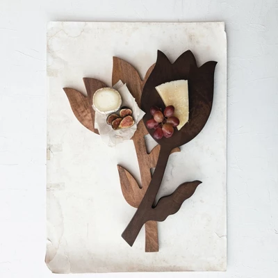 - A flower-shaped mango wood serving board that captures the eye with its natural elegance and intricate design