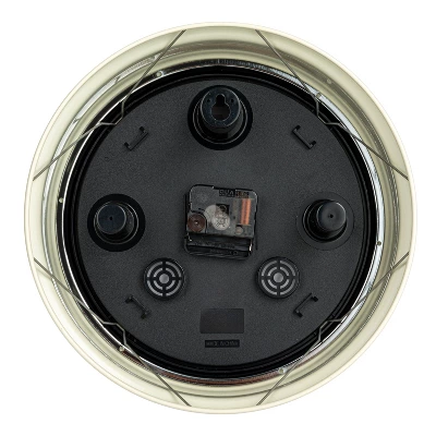 - A minimalist round metal wall clock with a lustrous chrome finish and a soothing cream-colored face