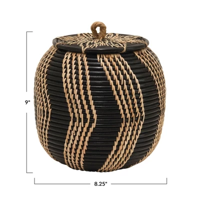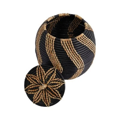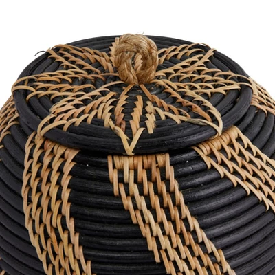 - A lidded basket that features masterfully handwoven rattan in a stylish two-tone design