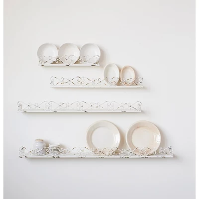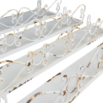 - This shabby chic set of decorative metal ledges features elegant scrollwork in four descending sizes in a heavily distressed finish