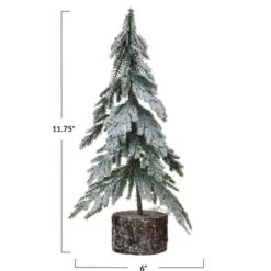 This green faux fir tree with a wood base and snow finish is a beautiful and realistic piece that will enhance any space. The tree is a vibrant and inviting piece with a fresh green color, a textured faux fir design, a rustic wood base, and a snow finish. Its green color creates a lively atmosphere, while the faux fir design adds authenticity. The snow finish adds sparkle and magic, making it a truly unique and enchanting display. The tree is made of polyethylene and China fir wood, with a soft and sturdy quality. It is easy to clean and maintain. The tree measures 6 inches in diameter and 11.75 inches in height. This is a versatile and stylish piece that can be placed on a table, shelf, or mantel. It is a lovely piece to complement any rustic or farmhouse-style decor.