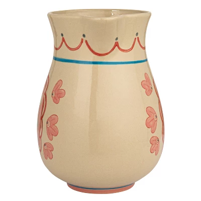 This Stoneware Pitcher is a celebration of craftsmanship and design, featuring a lovely floral pattern that wraps around its surface and a vibrant red handle for a pop of color. The spout is expertly crafted for smooth pouring, while the wide opening allows for easy filling and cleaning. With dimensions of 8.5 inches in length and 9.5 inches in height, it’s an ideal vessel for serving various beverages or showcasing fresh flowers. Its multi-hued palette and timeless design make it a versatile piece that complements a variety of decor styles, from the simplicity of Scandinavian to the warmth of Boho to the rustic elegance of French country. This pitcher is not only functional but also adds a touch of elegance to any table setting or room.