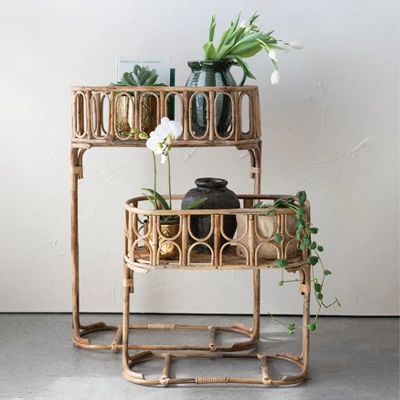This set of two handmade rattan planters in natural color is a lovely way to showcase beautiful plants. These planters are made of woven rattan that has a natural color and texture. The rattan is durable, and easy to clean. The planters have a rectangular shape and a curved top that give them a stylish and elegant look. The planters can be used to display plants, flowers, herbs, or succulents, either indoors or outdoors. However, they do not have drainage holes, so it is recommended to use them with liners or pots. The planters come in two sizes: the large one measures 25 inches in length, 11.5 inches in width, and 35 inches in height, and the small one measures 22.5 inches in length, 11.5 inches in width, and 21.5 inches in height. These handmade rattan planters are a perfect way to add some tropical, boho, or coastal flair to any space.