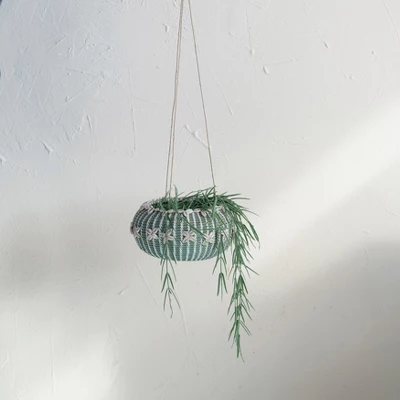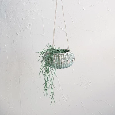 - Hanging handwoven rattan planter with shells and a jute hanger in an aqua finish
