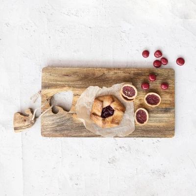 This natural mango wood cheese and cutting board with Santa hat cut-out, jute tie, and Santa hat block is a fun and festive piece that will enhance the dining experience. The board features a natural wood color that adds some warmth and charm to the table. The board also features a Santa hat cut-out that adds some flair and character, creating a stunning and unique display. The board also features a jute tie and a Santa hat block that make it easy to carry and store. The board is made of mango wood, which is smooth and durable. It is ideal for serving cheese, bread, fruits, or other snacks in style. The board measures 18 inches in length and 9 inches in width. This is the perfect piece to impress or treat anyone.