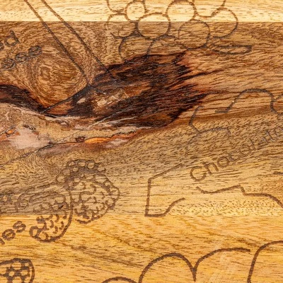 - A beautifully crafted mango wood cheese and serving board featuring a laser-etched charcuterie spread design