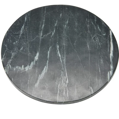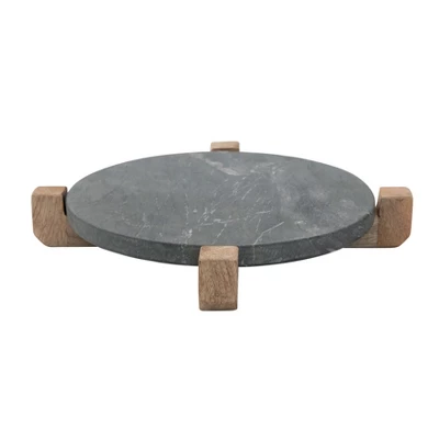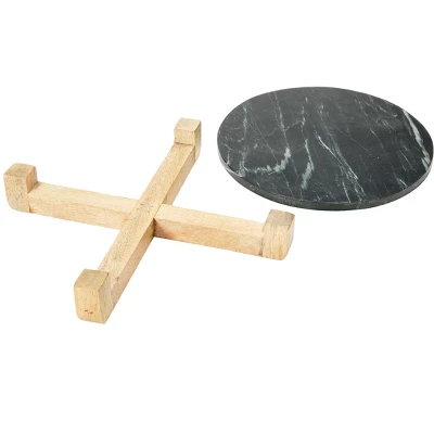 This serving board is a unique addition to any kitchen. Made out of marble with a black color, this board also has a mango wood stand with a natural coloring. This piece serves friends and family in style, and comes in with a stand.