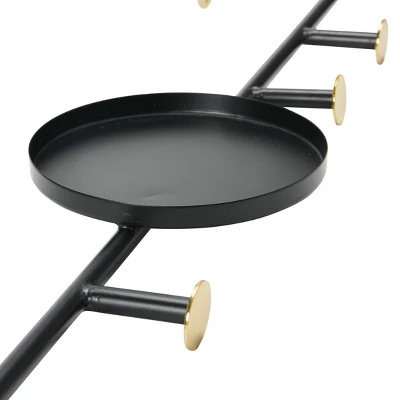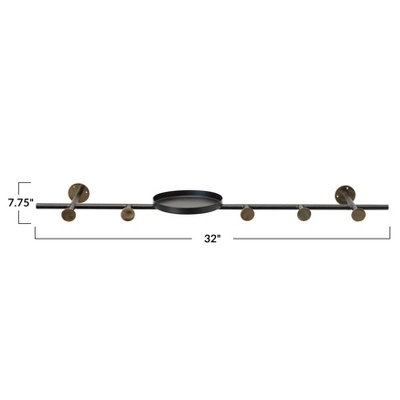 - An artfully designed metal wall hook with one round shelf has five handy hooks