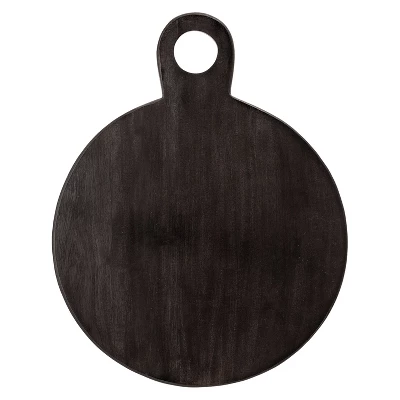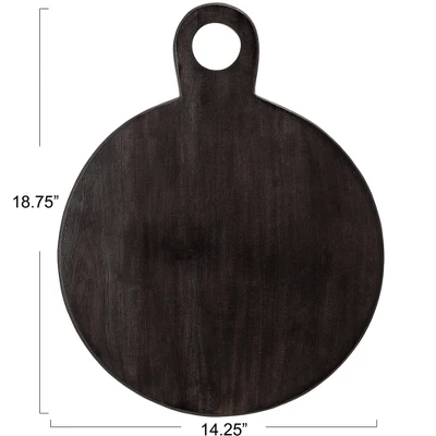 Enhance your kitchen with a touch of natural and modern elegance using our Round Acacia Wood Cheese/Cutting Board. Crafted from acacia wood, this board boasts a stylish black finish and a large round open handle for easy storage or display. Its sturdy design is perfect for serving cheese, charcuterie, fruits, or breads, as well as for chopping and slicing ingredients. The smooth surface complements any decor seamlessly. Measuring 18.75 inches in length and 14.25 inches in width, this board is conveniently sized for various occasions. Maintain its beauty by hand washing with mild soap and water, ensuring thorough drying—avoid soaking and dishwasher use. Whether enhancing your kitchen or as a thoughtful gift, this cutting board is a stylish and practical choice.