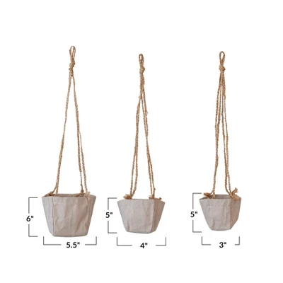 - These natural jute and cotton hanging planters features a round shape and a rope hanger for a rustic and charming look
