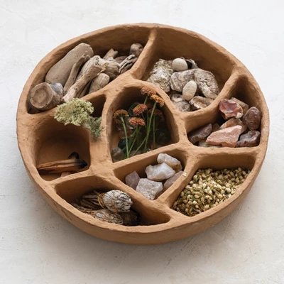- This organically shaped wall shelf features eight display sections and naturally variating paper mache construction
