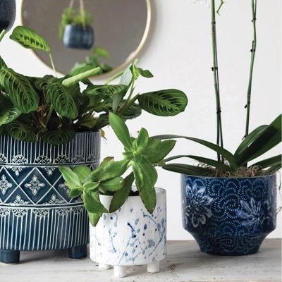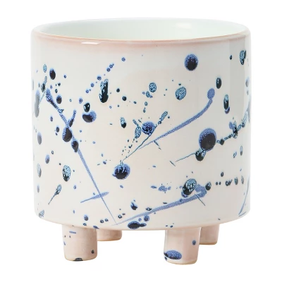 - Add a splash of color and texture to the indoor plants with this stunning stoneware planter that features a white base and a blue splatter design