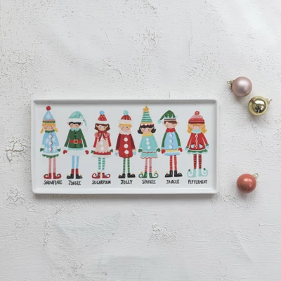 - A festive stoneware platter featuring a charming print of Santa’s elves in vibrant multicolor